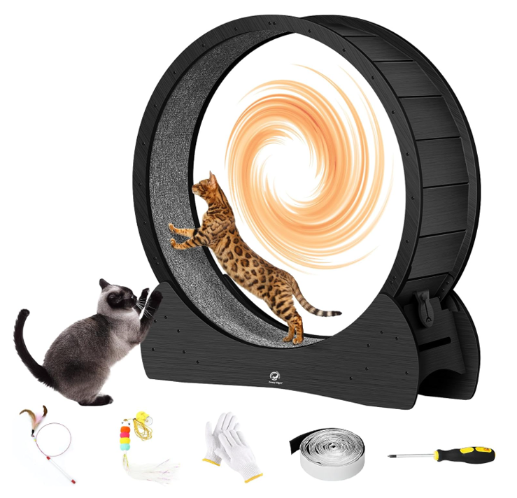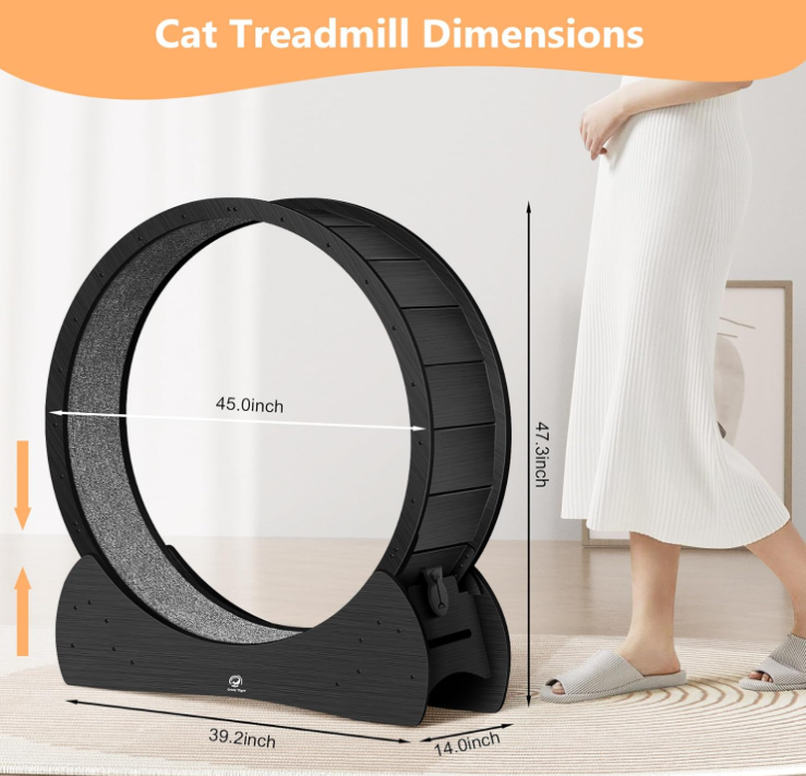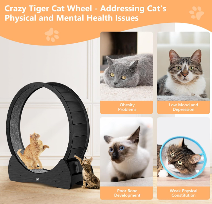 - π New upgraded large-sized cat treadmill: The Crazy Tiger Cat Wheel is made of high-quality materials, with a massive inner diameter of 40 inches and a weight of up to 48 pounds. It can bear a maximum weight of 80 pounds, eliminating concerns about your cat’s weight. The widened and reinforced base design completely encloses the running wheel, ensuring stability without worries of tipping over.